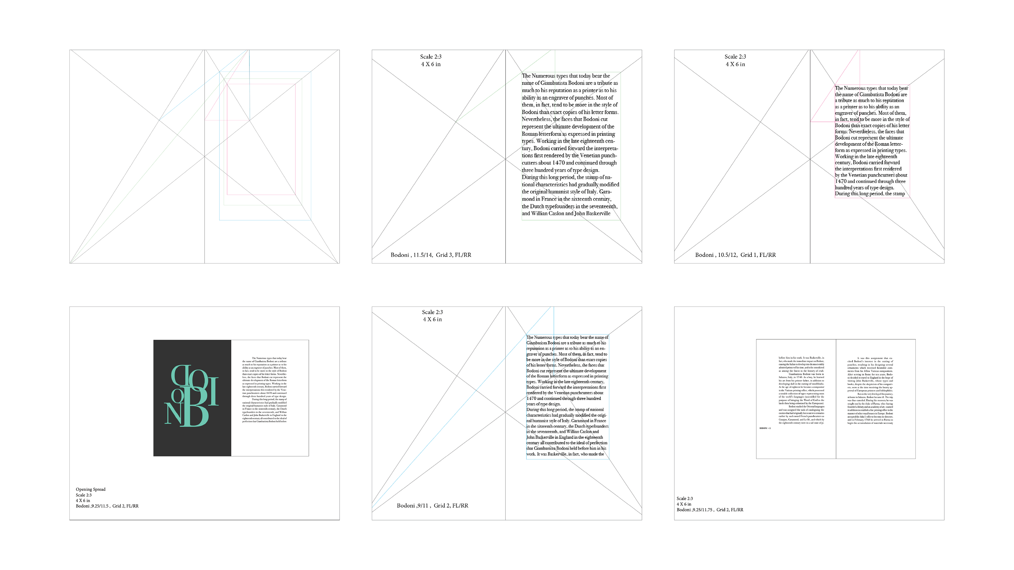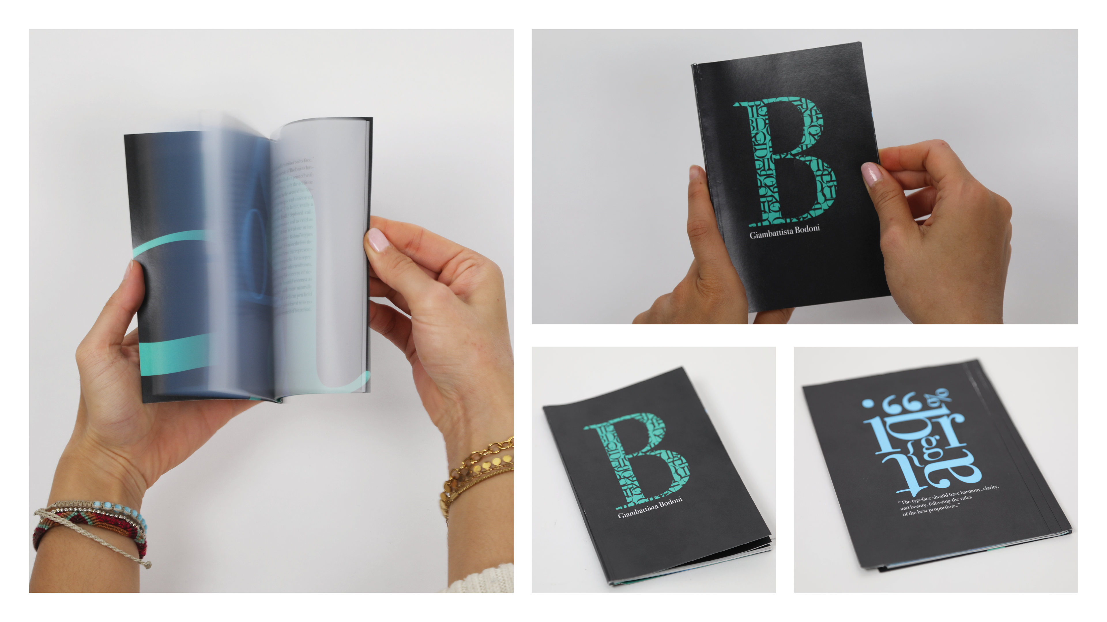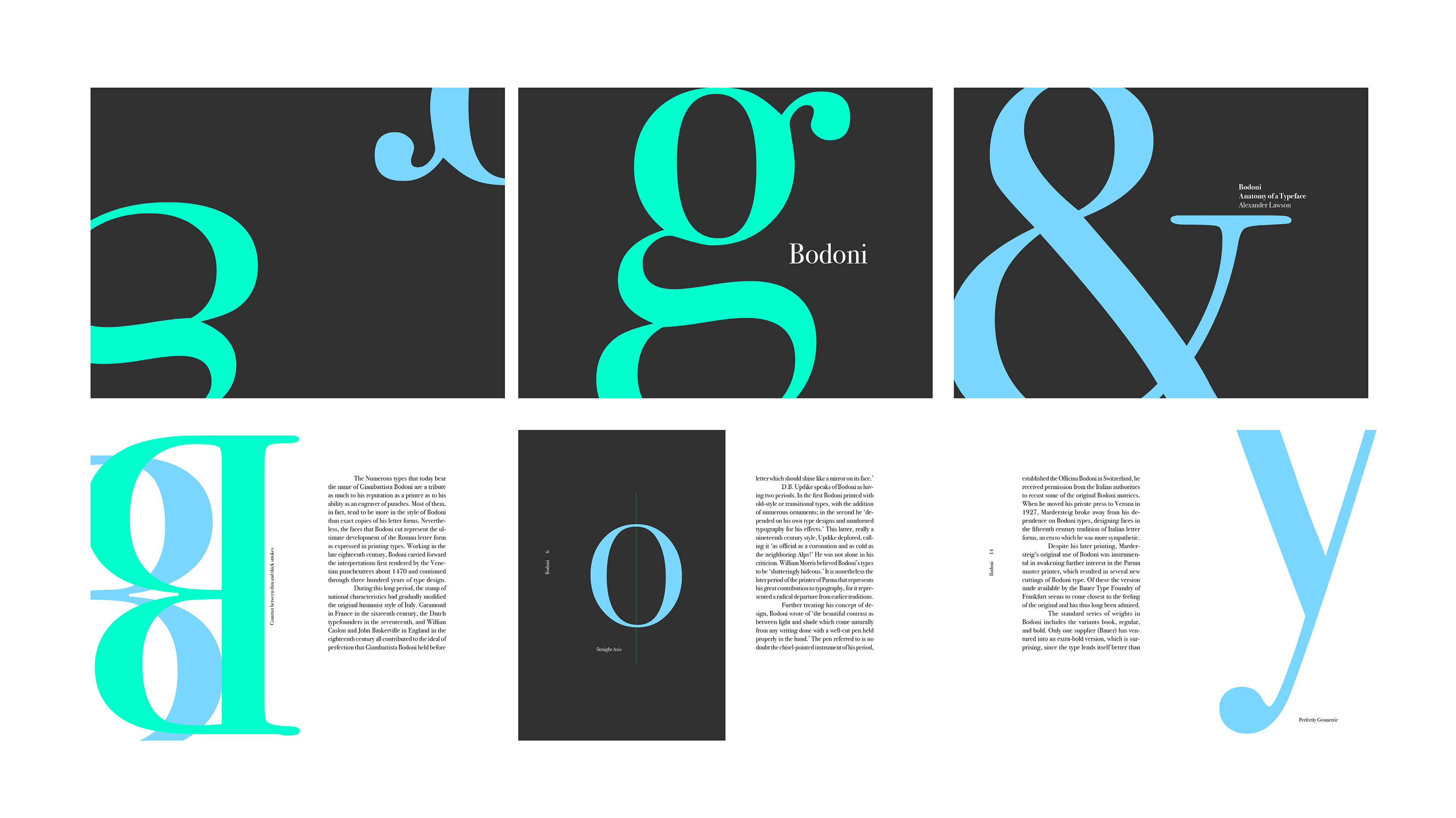 This Bodoni type specimen book, with text extracted from Anatomy of a Typeface, explores the typeface’s characteristics through a delicate, small format. Bound using the perfect binding technique, the design features a strong color contrast, adding elegance and reflecting Bodoni’s Italian heritage.