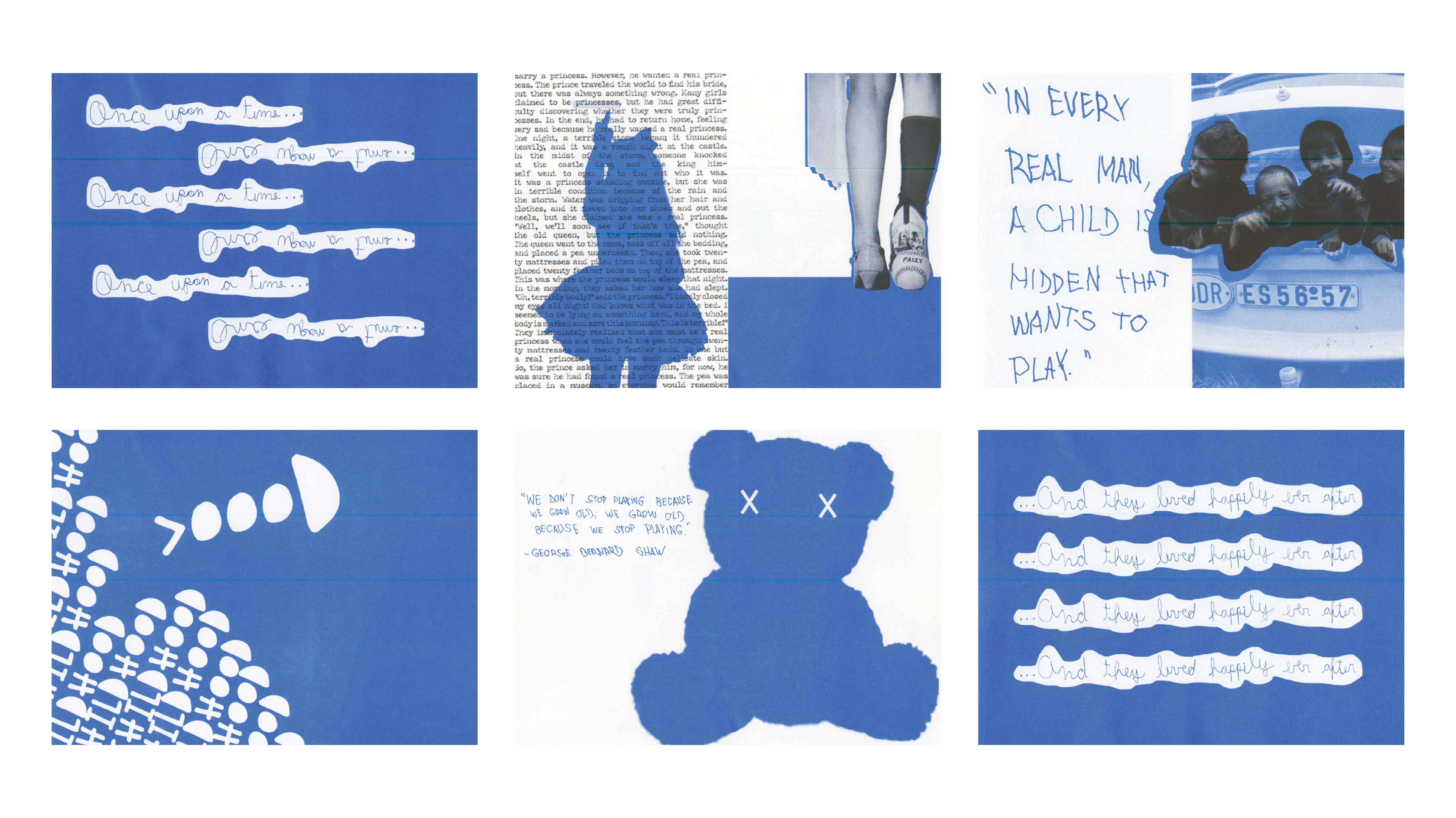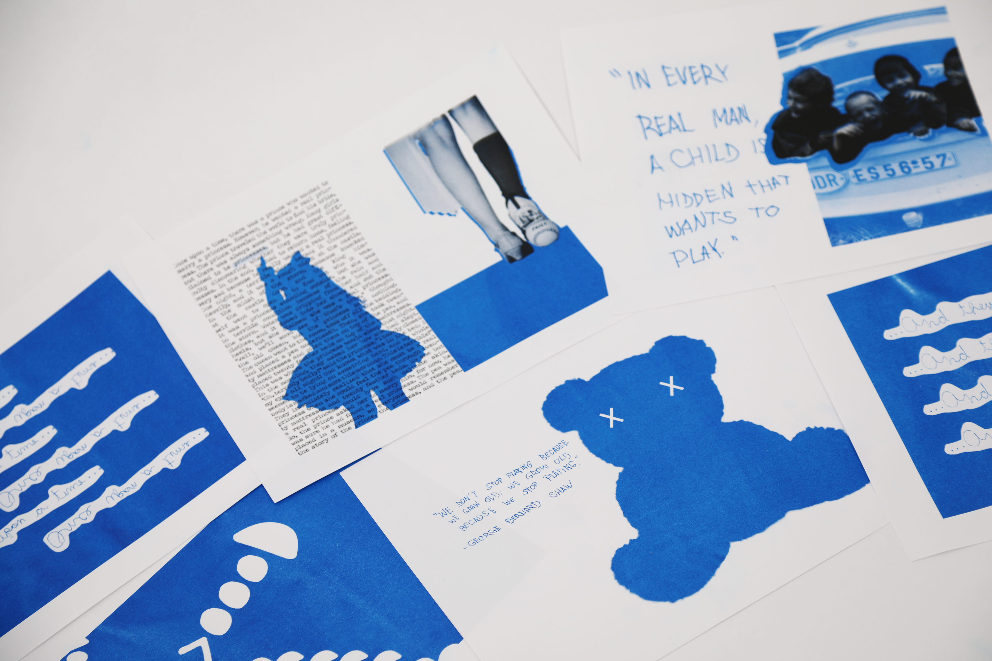 This zine explores the concept of fun through the lens of childhood. For children, fun means freedom — a fearless openness to play and imagination. Featuring collages, handwritten typefaces (scanned and printed), and risography, the zine embraces playfulness. A blue and white palette reflects both joy and calm.